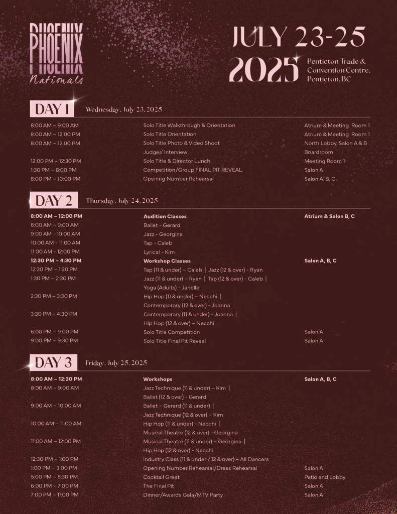 Our Phoenix GALA will happen on the final day of the Nationals competition. This is a formal dinner and show experience. The GALA will consist of the TITLE SOLOISTS opening number, Solo Title & Group PIT Competition, show case performances from our workshops, guest performances, Overalls and Grand Awards.